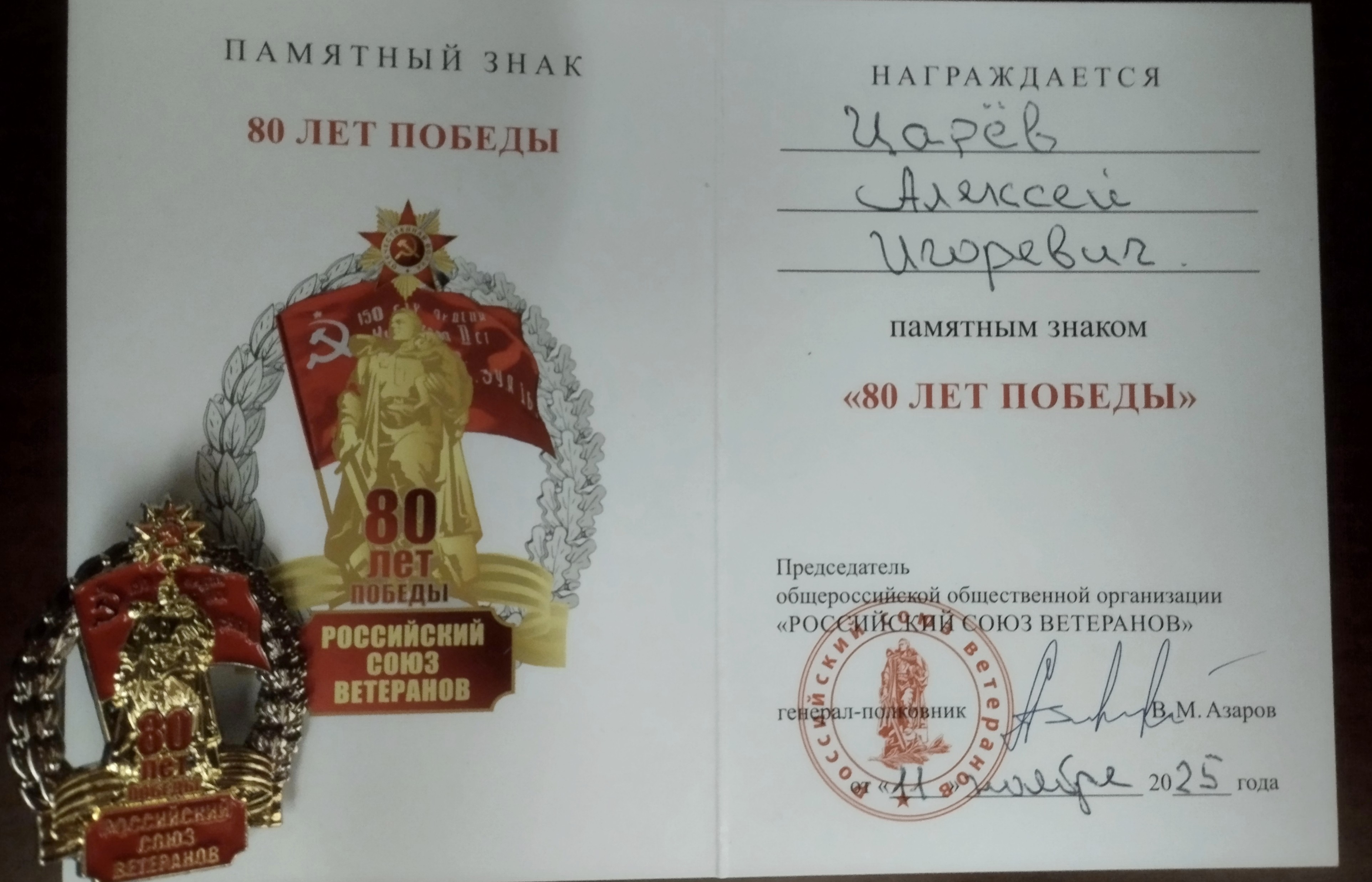 Царёв Алексей Игоревич — автор и руководитель проекта «Почётный караул» Фонда удостоен Памятного знака «80 ЛЕТ ПОБЕДЫ» в стенах Общероссийской общественной организации ветеранов «РОССИЙСКИЙ СОЮЗ ВЕТЕРАНОВ».