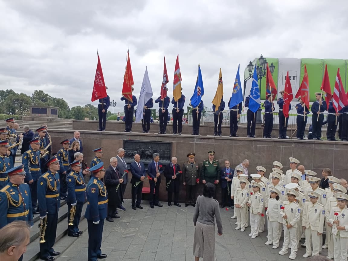 Торжественная церемония возложения цветов прошла у горельефа, открытого 3 сентября 2023 года на Манежной площади — к годовщине Победы над милитаристской Японией и окончания Второй мировой войны.