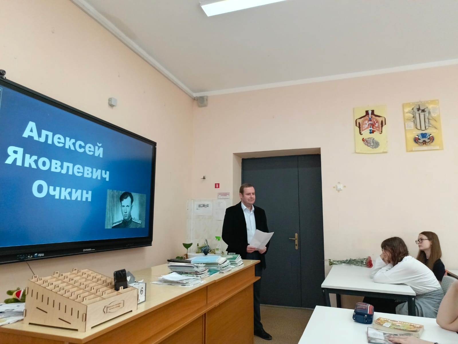 Перед восьмиклассниками выступили Юрий Московский — секретарь Попечительского совета Московского педагогического государственного университета, член Совета Московского регионального отделения МОПД ‘ВЕЧНО ЖИВЫЕ’ и Алексей Царёв — участник МОПД ‘ВЕЧНО ЖИВЫЕ’, представитель Фонда ‘Легендарный Подвиг’.