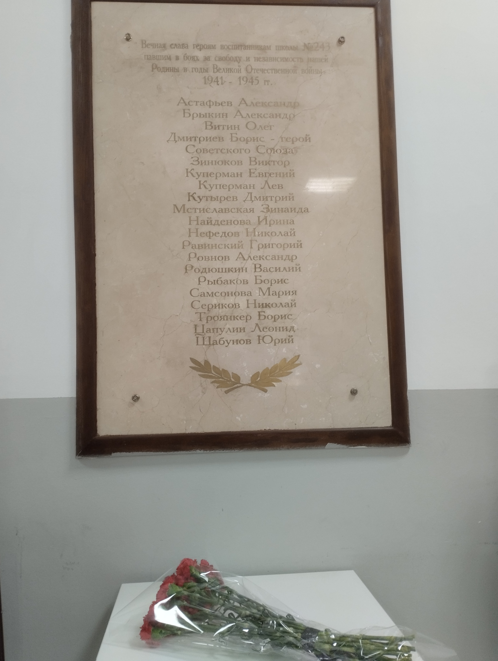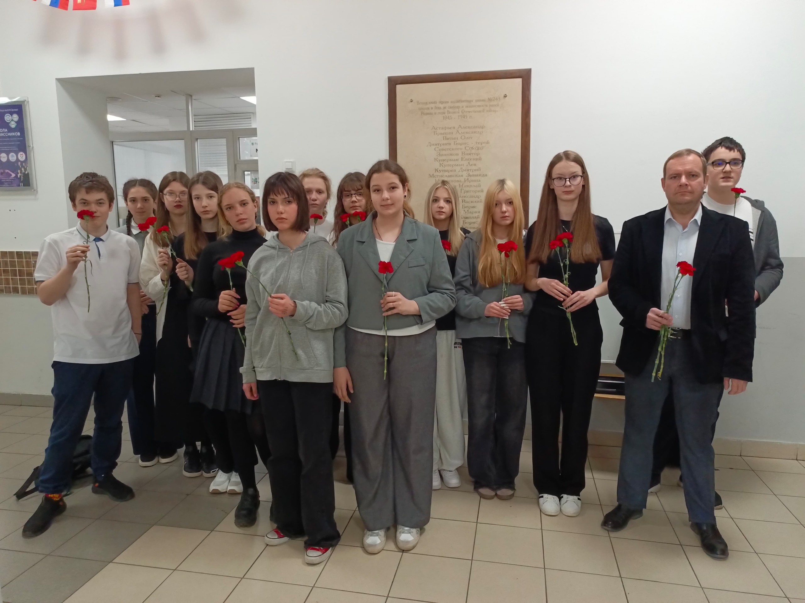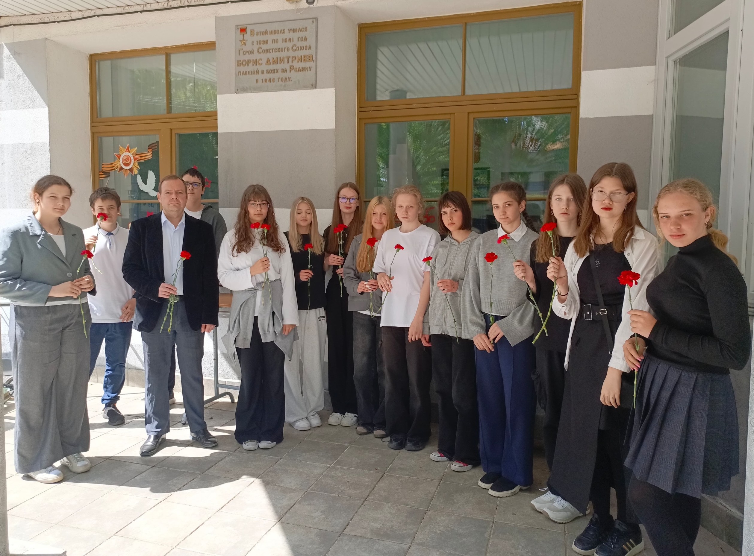 С обучающимися школы почтили память участников Великой Отечественной войны минутой молчания и возложили цветы к мемориальным доскам, расположенным в школе: героям-воспитанникам школы и Герою Советского Союза Борису Дмитриеву — выпускнику учебного заведения, партизану, в девятнадцать лет павшему смертью храбрых в бою на территории Белорусской ССР.