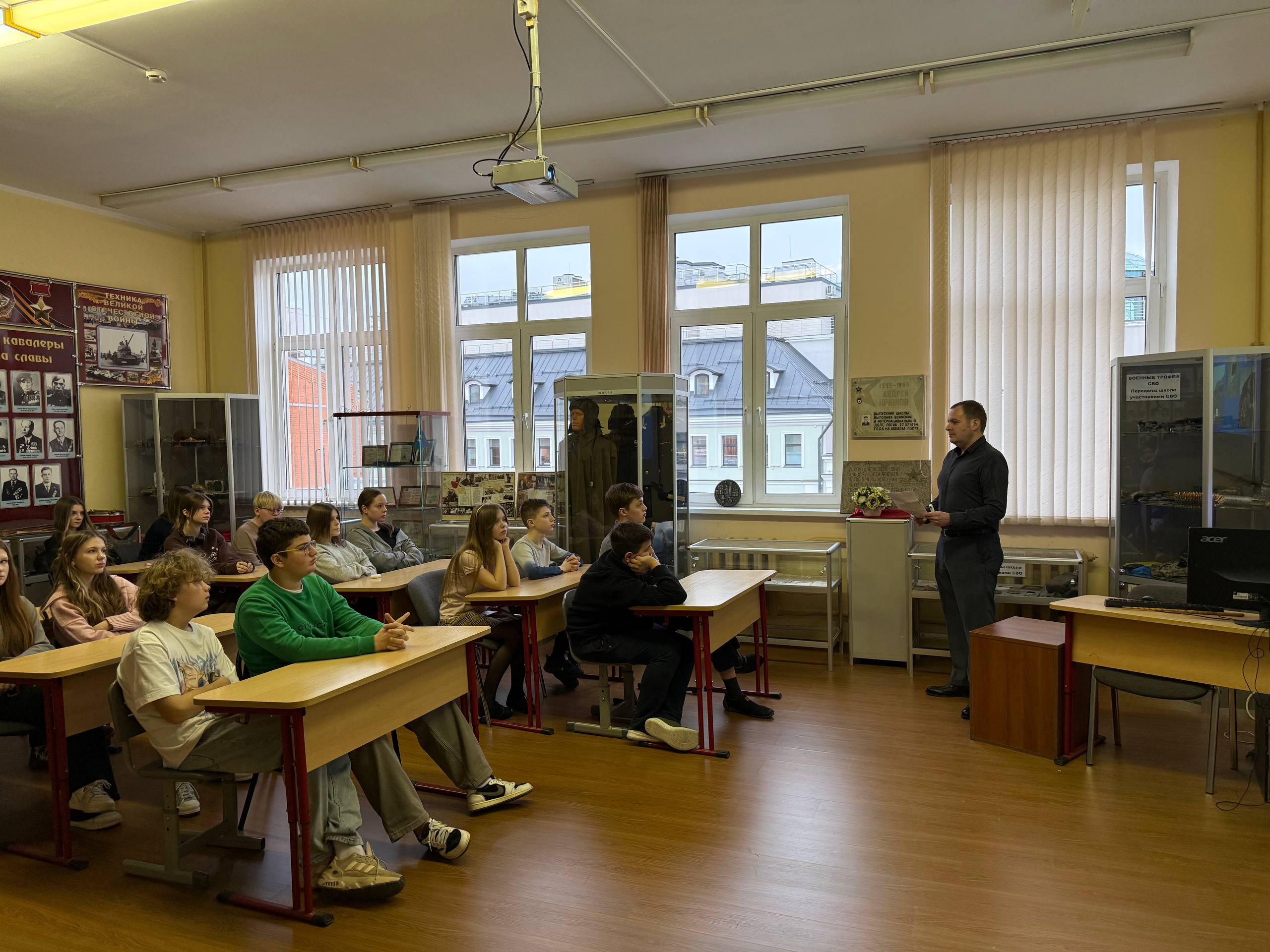 Автор и руководитель проекта ‘Почётный караул’ Алексей Царёв рассказал учащимся 8Б о героях Великой Отечественной войны, отваге и самопожертвовании солдат и офицеров Красной Армии.