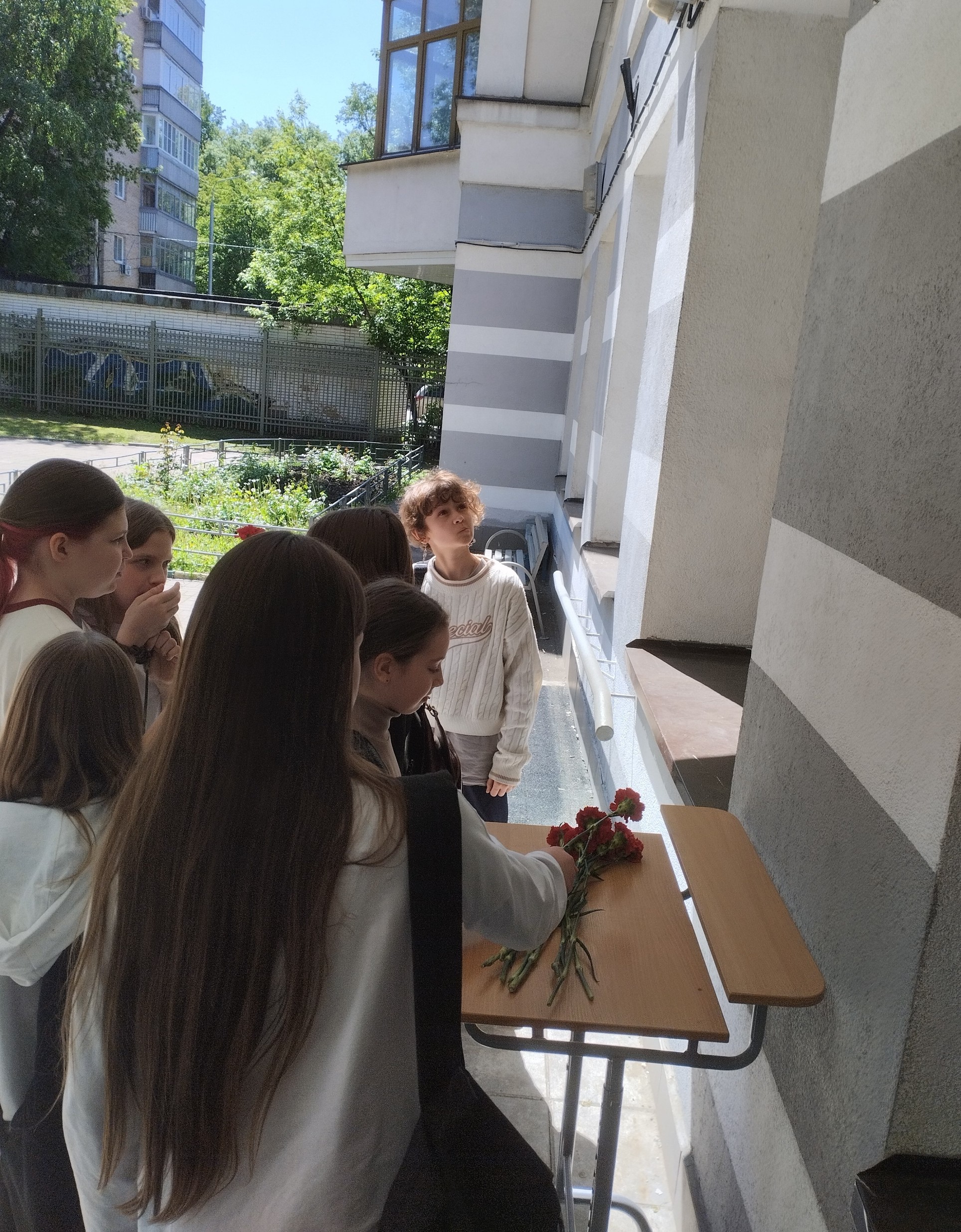 С учащимися почтили память участников Великой Отечественной войны минутой молчания и возложили цветы к мемориальным доскам, расположенным в школе: героям-воспитанникам школы и Герою Советского Союза, девятнадцатилетнему Борису Дмитриеву.